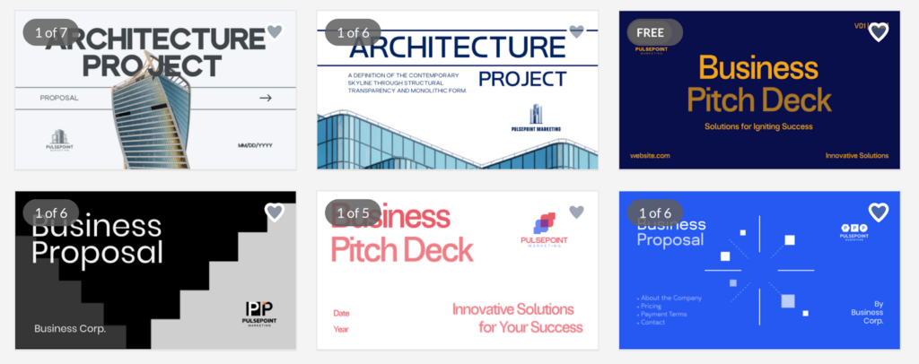 - Industry-based categories (corporate, pitch decks, startup, marketing agency, tech reports, and more)