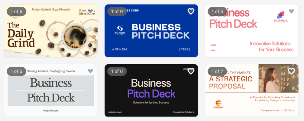 Templates range from minimal corporate decks to highly visual, creative layouts. Here are some template examples we found on Canva: